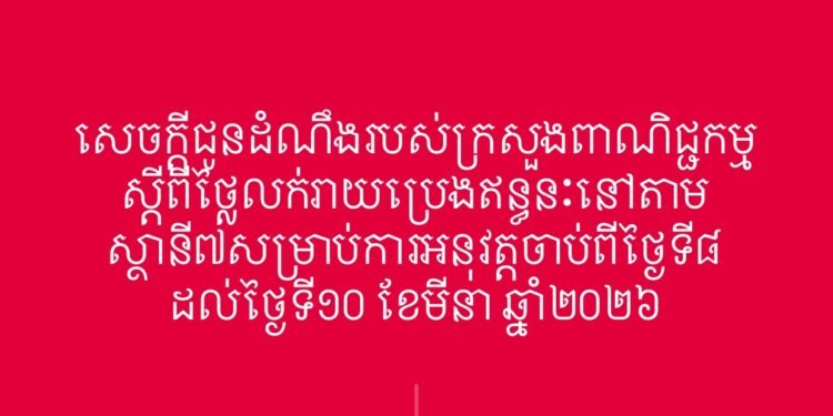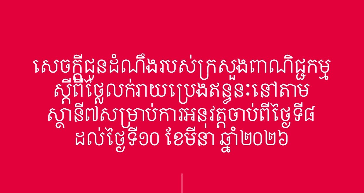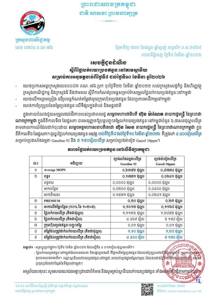 សេចក្តីជូនដំណឹងរបស់ក្រសួងពាណិជ្ជកម្ម ស្តីពីថ្លៃលក់រាយប្រេងឥន្ធនៈនៅតាមស្ថានី៧សម្រាប់ការអនុវត្តចាប់ពីថ្ងៃទី៨ ដល់ថ្ងៃទី១០ ខែមីនា ឆ្នាំ២០២៦