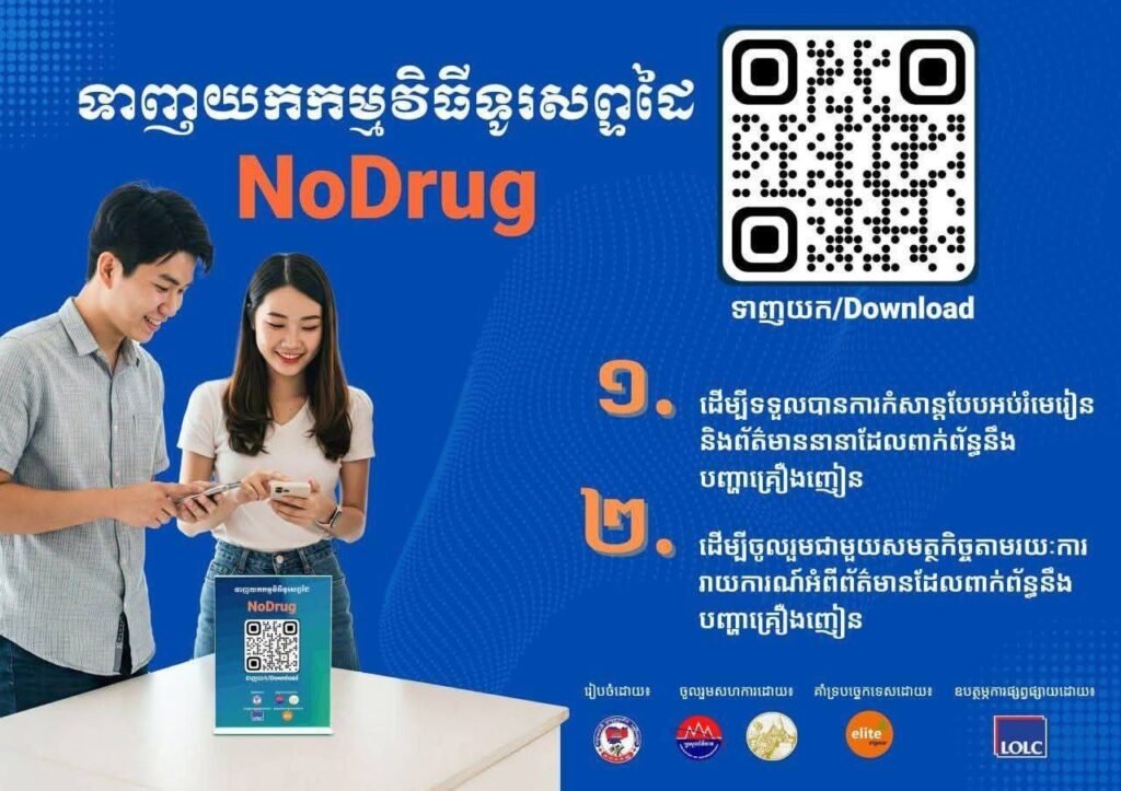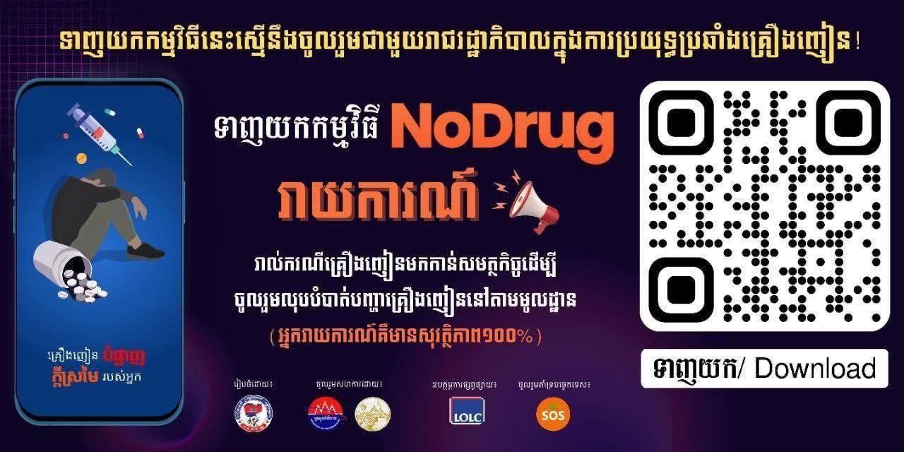 សូមអំពាវនាវដល់អ្នកពាក់ព័ន្ធទាំងអស់ ចូលរួមប្រើប្រាស់ APP NoDrug ទាំងអស់គ្នា ព្រមទាំងជួយផ្សព្វផ្សាយដល់សមាជិកគ្រួសារ មិត្តភ័ក្តិឲ្យប្រើប្រាស់ទាំងអស់គ្នា ដើម្បីចូលរួមជាមួយនឹងរាជរដ្ឋាភិបាលក្នុងការប្រយុទ្ធប្រឆាំងគ្រឿងញៀនខុសច្បាប់។