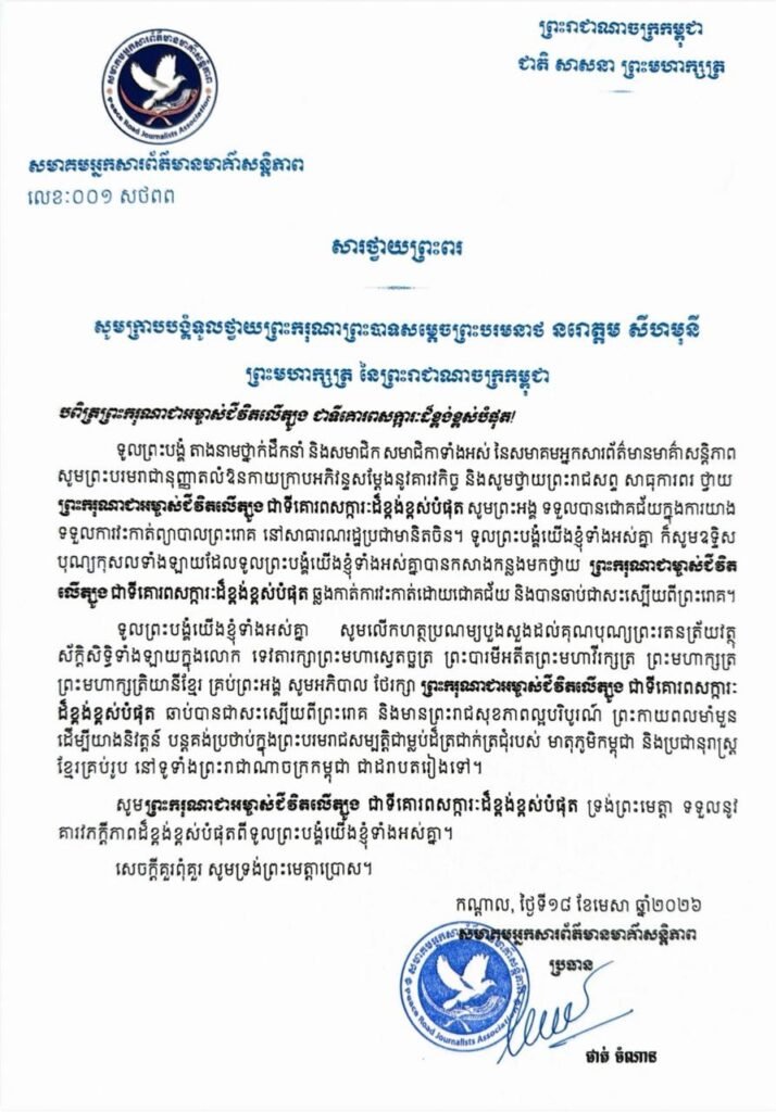 សមាគមអ្នកសារព័ត៌មានមាគ៌ាសន្តិភាពក្រាបបង្គំទូលថ្វាយសារលិខិតថ្វាយព្រះពរព្រះករុណាព្រះបាទសម្តេចព្រះបរមនាថនរោត្តមសីហមុនីព្រះមហាក្សត្រនៃព្រះរាជាណាចក្រកម្ពុជាក្នុងឱកាសដែលព្រះអង្គស្តេចយាងទទួលការវះកាត់ព្យាបាលព្រះរោគនៅរដ្ឋធានីប៉េកាំងសាធារណរដ្ឋប្រជាមានិតចិន