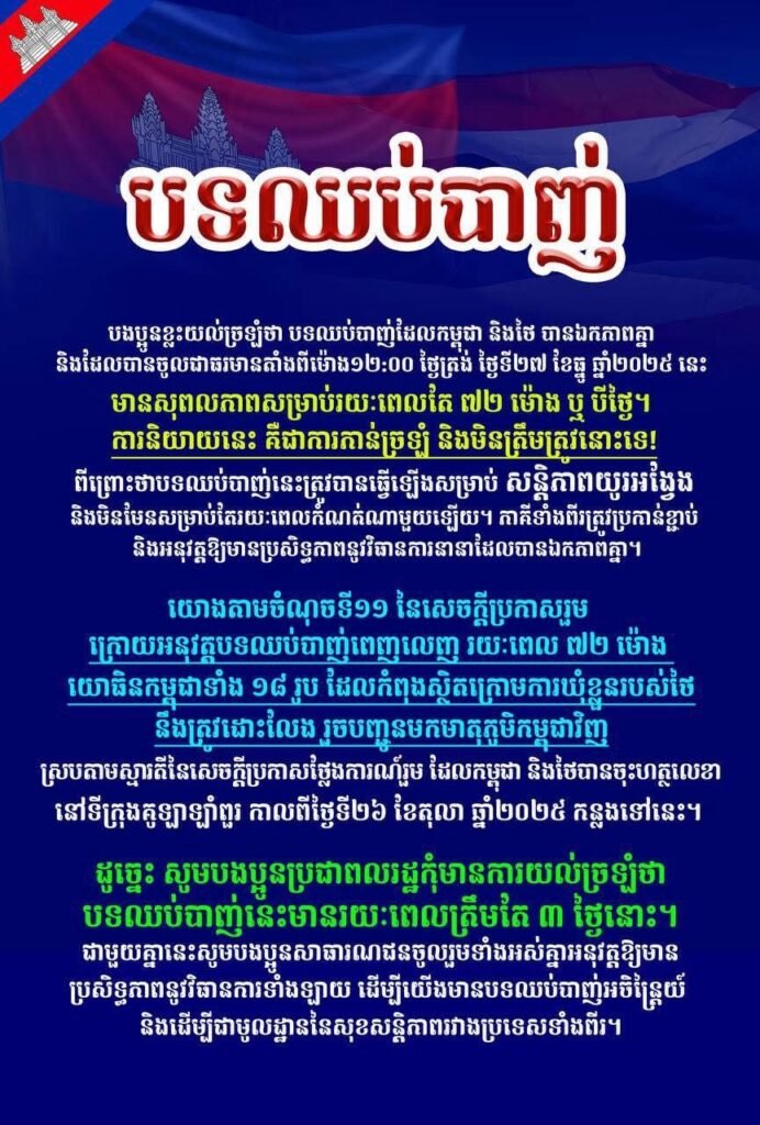 បងប្អូនខ្លះយល់ច្រឡំថា បទឈប់បាញ់ដែលកម្ពុជានិងថៃ បានឯកភាពគ្នា និងដែលបានចូលជាធរមានតាំងពីម៉ោង១២:០០ ថ្ងៃត្រង់ ថ្ងៃទី២៧ ខែធ្នូ ឆ្នាំ២០២៥ នេះ មានសុពលភាពសម្រាប់រយៈពេលតែ ៧២ ម៉ោង ឬ បីថ្ងៃ។ ការនិយាយនេះ គឺជាការភាន់ច្រឡំ និងមិនត្រឹមត្រូវនោះទេ! ពីព្រោះថាបទឈប់បាញ់នេះត្រូវបានធ្វើឡើងសម្រាប់សន្តិភាពយូរអង្វែង និងមិនមែនសម្រាប់តែរយៈពេលកំណត់ណាមួយឡើយ។ ភាគីទាំងពីរត្រូវប្រកាន់ខ្ជាប់ និងអនុវត្តឱ្យមានប្រសិទ្ធភាពនូវវិធានការនានាដែលបានឯកភាពគ្នា។