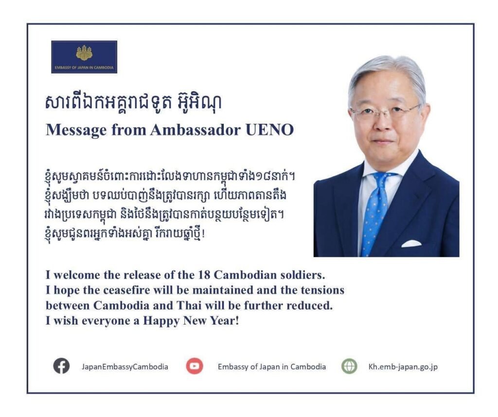 ឯកអគ្គរដ្ឋទូតសហភាពអឺរ៉ុបនិងឯកអគ្គរាជទូតជប៉ុន ចេញសារស្វាគមន៍ចំពោះការដោះលែងទាហានកម្ពុជាទាំង១៨នាក់ និងសង្ឃឹមថា បទឈប់បាញ់នឹងត្រូវបានរក្សា ហើយភាពតានតឹងរវាងប្រទេសកម្ពុជា និងថៃនឹងត្រូវបានកាត់បន្ថយបន្ថែមទៀត។